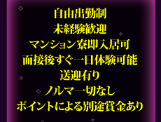 | 待遇 | ■時給制 ■自由出勤制 ■未経験者歓迎 ■マンション寮即入居可 ■面接後すぐに1日体験可能 ■送迎あり ■ノルマ一切なし ■オープン~orラストまで働ける方は出勤日に応じて、交通費全額支給 |